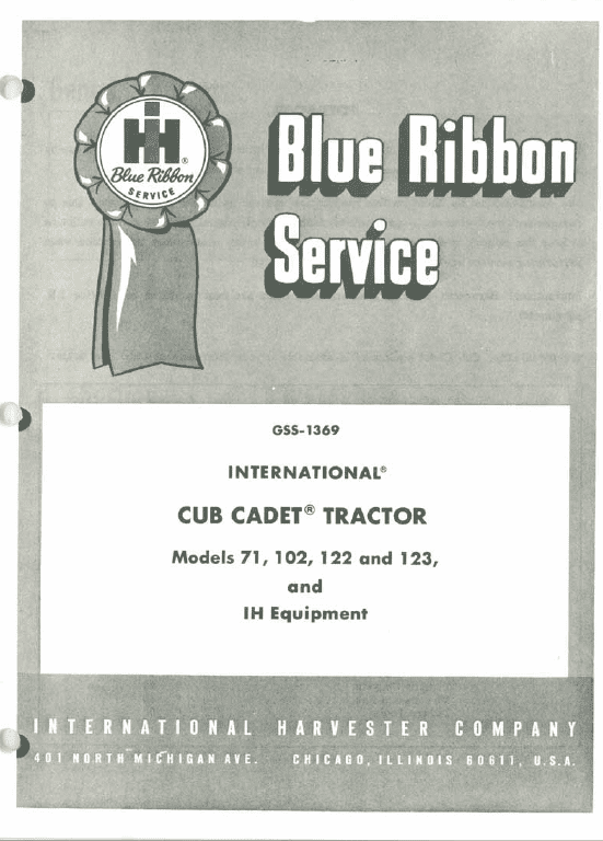 The Cub Cadet 71, 102, 122 and 123 tractors manual instruction are for use by trained technicians who are experienced in the service and repair of outdoor power equipment of the kind described in this publication GSS-1369.