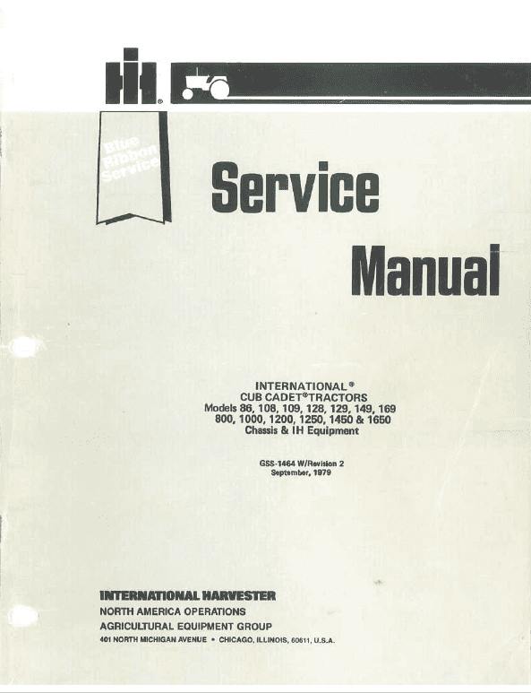 The Cub Cadet 800, 1000, 1200, 1250, 1450 and 1650 tractors manual instruction are for use by trained technicians who are experienced in the service and repair of outdoor power equipment of the kind described in this publication GSS-1464 W.