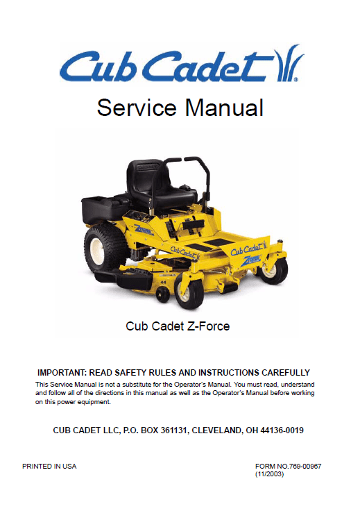 The Cub Cadet Z Force Lawn Tractor tractors manual instruction are for use by trained technicians who are experienced in the service and repair of outdoor power equipment of the kind described in this publication.