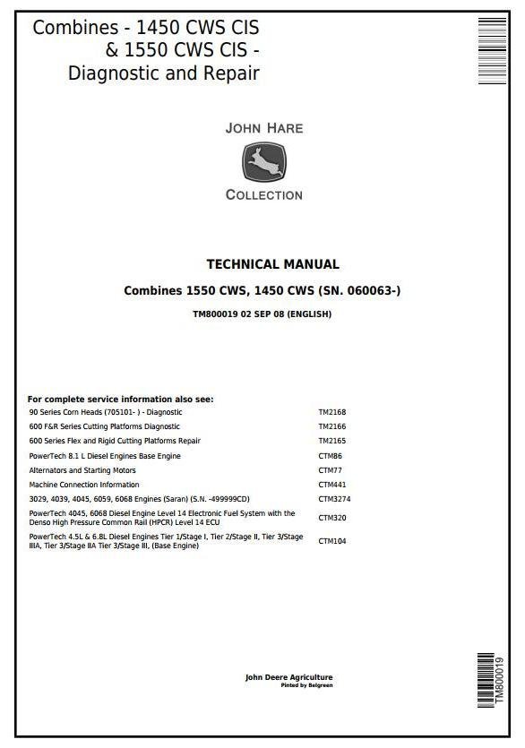 TM800019 – John Deere 1450CWS, 1550CWS (SN.060063-) CIS Combines Diagnostic & Repair Technical Manual