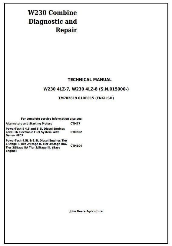 TM702819 – John Deere W230 (4LZ-7,4LZ-8) Combine (SN.015000-) Diagnostic and Repair Technical Manual
