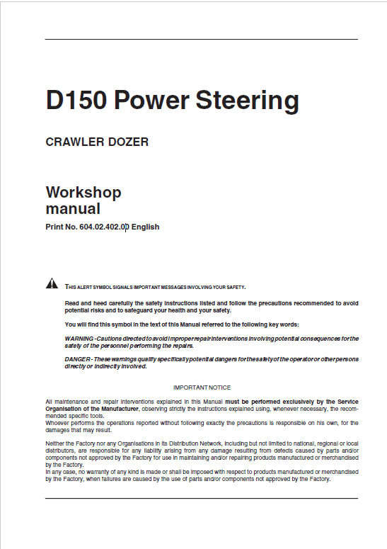 When carrying any repair or maintenance on the Bulldozer ensure you read the safety guideline beforehand. This will prevent any incident and ensure that the best practices in the manual is followed. When doing any work on the Bulldozer, always observe the instructions given in the Workshop Manual. Extensive works not described in the New Holland D150 Workshop Manual will gladly be executed for you by your dealer. Always use original spare parts when replacing any component.
