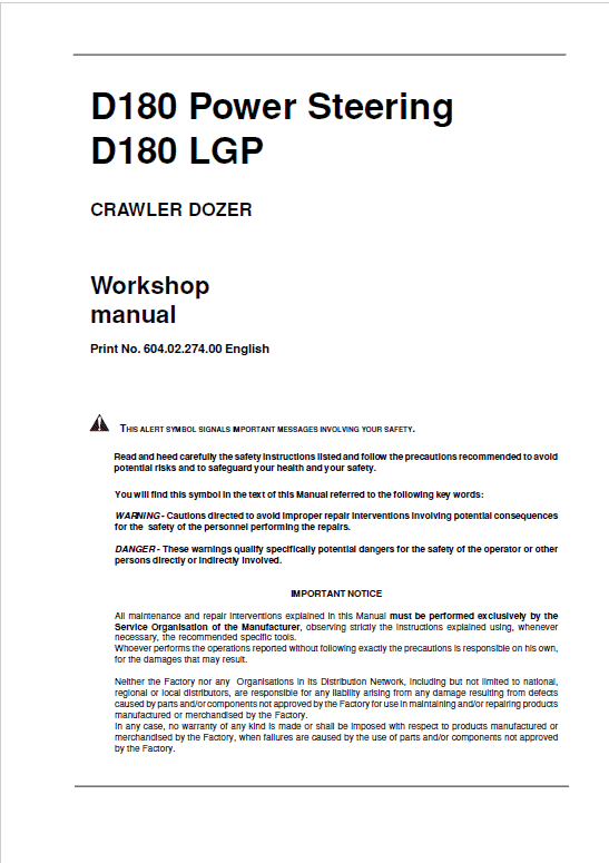 The Manual is divided into main groups and subgroups, and covers any previous version of the D180 LT, D180 XLT, D180 LGP Bulldozer. Any additions or modifications which can happen at a later date are not describe in this manual. The required information can easily be found by referring to the table of contents. For reasons of clarity, some of the illustrations are presented in simplified form in this service manual.