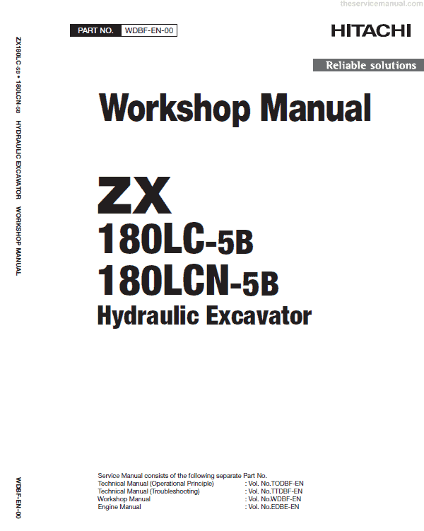 Hitachi ZX180LC-5B and ZX180LC-5G service manual consists of the Operating, Troubleshooting and the Workshop Manual.