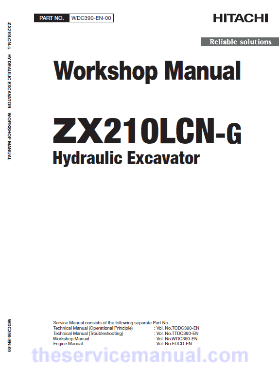 Hitachi ZAXIS ZX210LCN-G service manual consists of the Operating, Troubleshooting and the Workshop Manual.