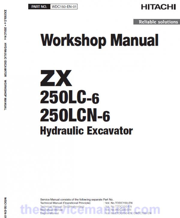 Hitachi ZAXIS ZX250LC-6 and ZX250LCN-6 service manual consists of the Operating, Troubleshooting and the Workshop Manual.