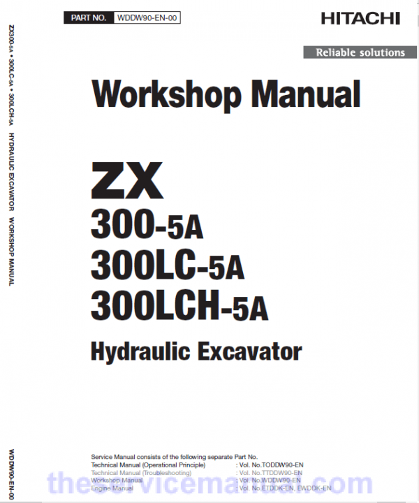 The manual is applicable for the Hitachi Excavator Model ZX300-5A, ZX300LC-5A and ZX300LCH-5A