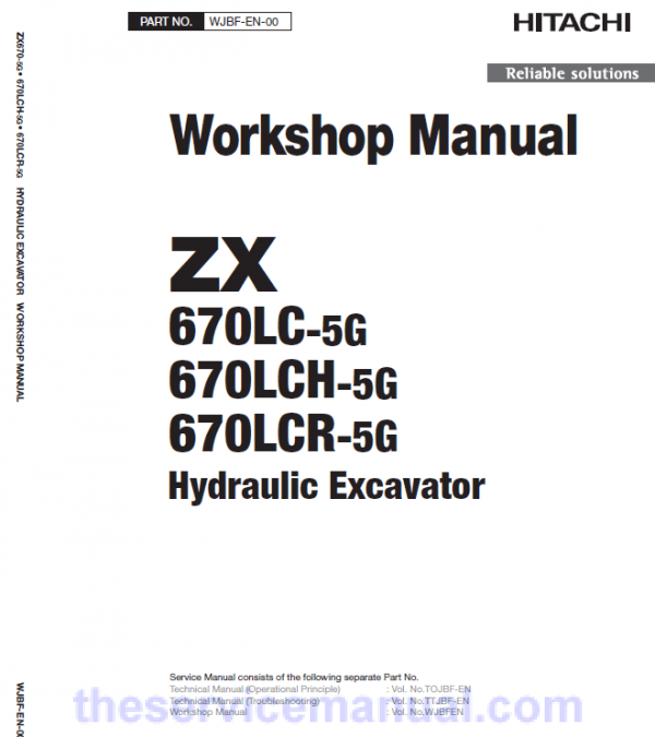 Hitachi ZX670LC-5G, ZX670LCR-5G and ZX670LCH-5G service manual consists of the Operating, Troubleshooting and the Workshop Manual.