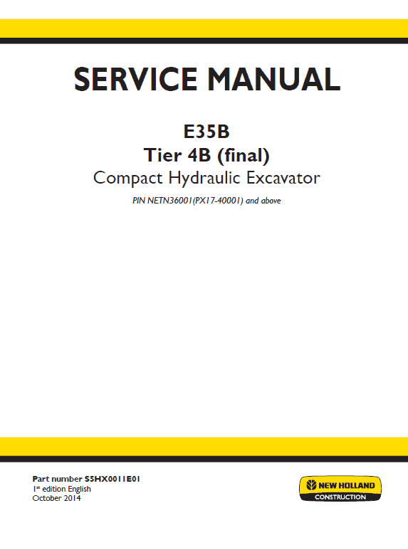 This manual covers the repair and adjustment procedures for the New Holland Model E35B Tier 4B Excavator. All repair and maintenance work listed in this manual must be carried out only by qualified personnel, strictly complying with the instructions given, and using, whenever possible, the special tools.