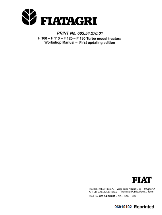 The Fiat Service Manual provides you with all the technical specification and information needed for you to properly service the Fiat Tractor F100, F110, F120, F130. By using this repair service manual in addition to your operators manual supplied, you should be able to correctly service and maintain your tractor.