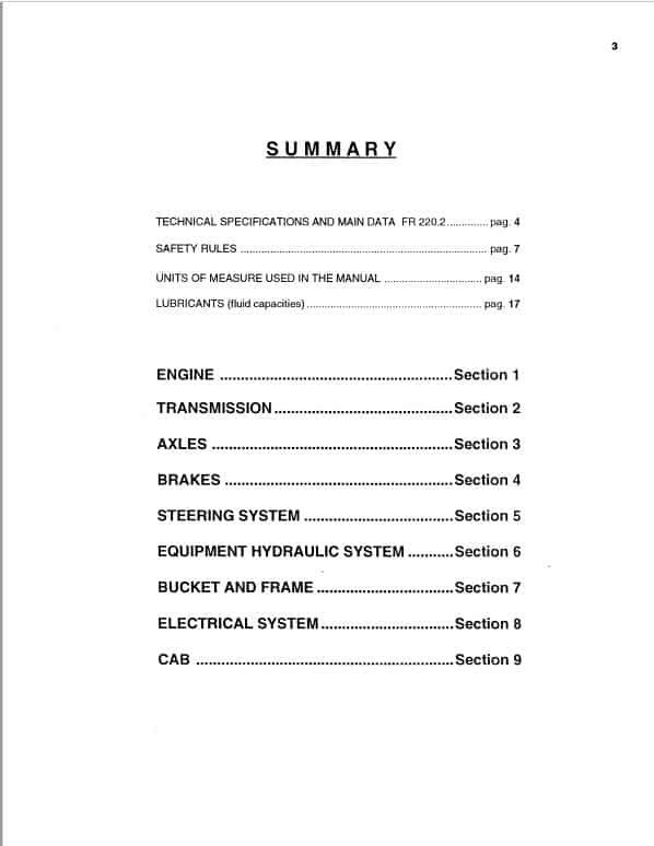 Table of Content of the Fiatallis FR220.2 Wheel Loader Manual: