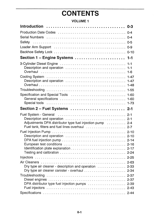 Table of Content of the 250C, 260C, 345D, 445D, 545D Tractors Manual: