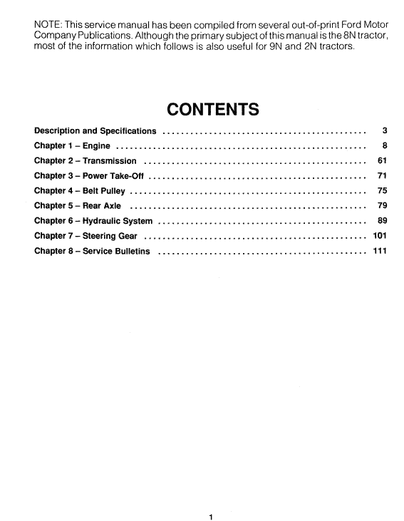 This service manual has been compiled from several out-of-print Ford Motor Company Publications. Although the primary subject of this manual is the 8N tractor, most of the information which follows is also useful for 9N and 2N tractors.