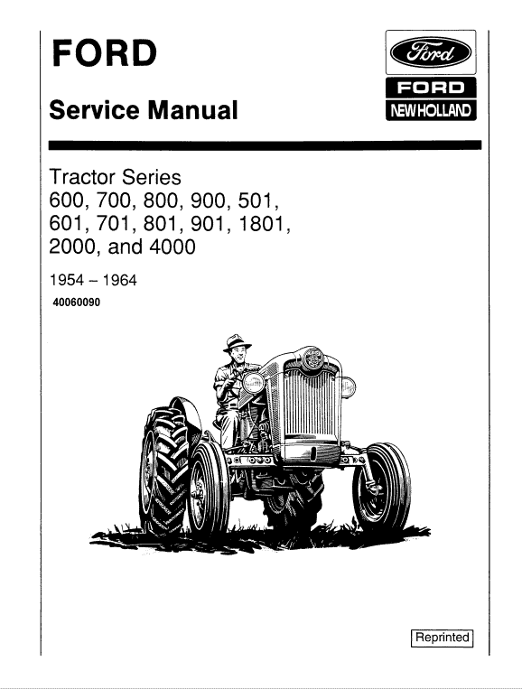 This Ford 501, 600, 601, 700, 701, 800, 801 Tractor manual contains complete service information on all Series 600 through 1801 Ford Tractors. The information contained herein will be useful to the inexperienced mechanics as well as the experienced ones.