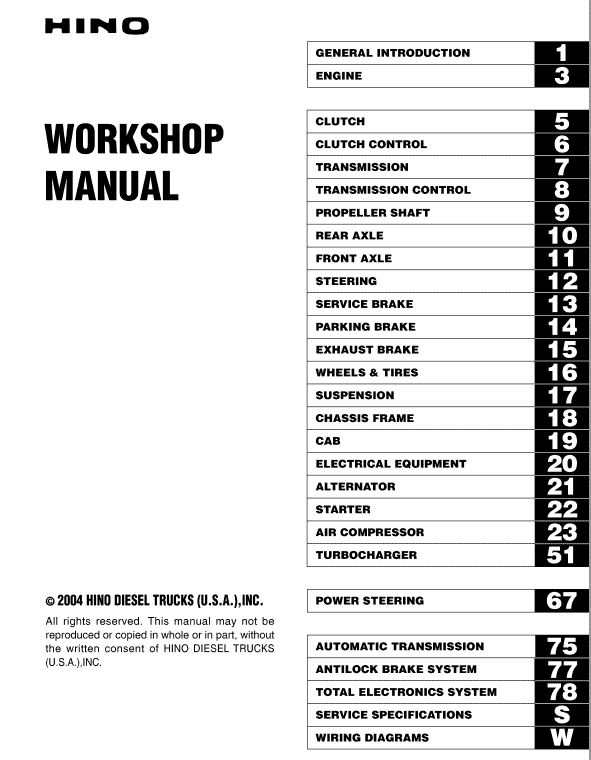 This workshop manual has been prepared to provide information covering repairs on FA, FB series Hino 2004 trucks.
