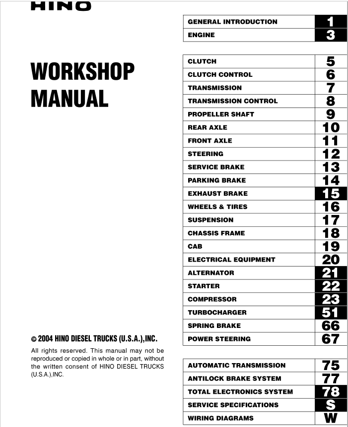 Table of Content For Hino 2004 Truck Manual: