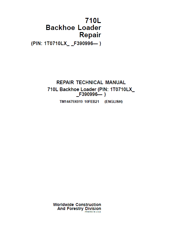 The John Deere 710L (Serial No. after F390996 -) Backhoe Loader Technical manuals are divided in two parts: repair and operation and tests. Repair sections tell how to repair the components. Operation and tests sections help you identify the majority of routine failures quickly.