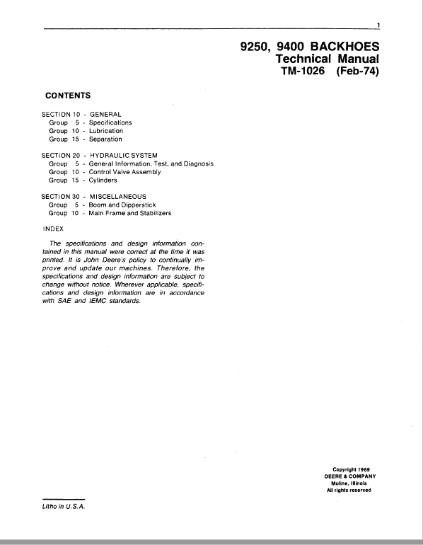 John Deere 9250, 9400 Backhoe Loader Technical Manuals are concise service guides for a specific machine. Technical Manuals are on-the-job guides containing only the vital information needed by a journeyman mechanic