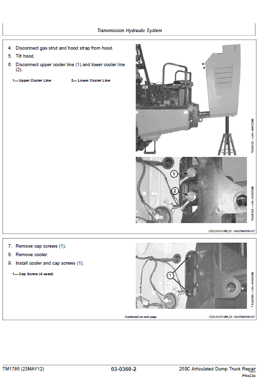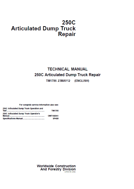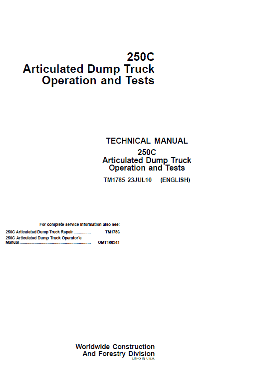 The John Deere 250C Articulated Dump Truck Technical manuals are divided in two parts: repair and operation and tests. Repair sections tell how to repair the components. Operation and tests sections help you identify the majority of routine failures quickly.