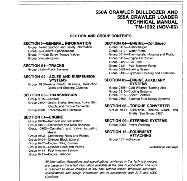 John Deere 550A, 555A Crawler Bulldozer Loader Service Manual TM1292 Sections: