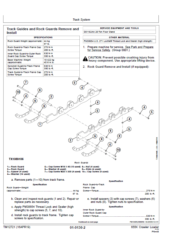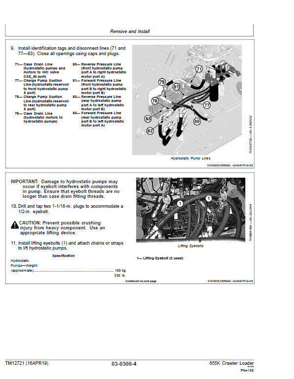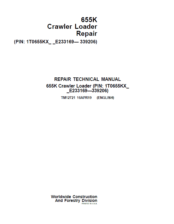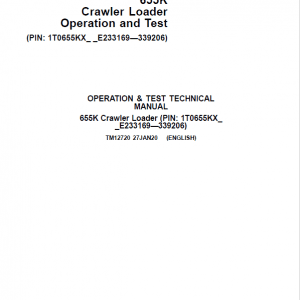The John Deere 655K (Serial from E233169-E339206) Crawler Loader Technical manuals are divided in two parts: Repair and Operation and Tests.