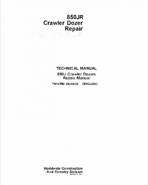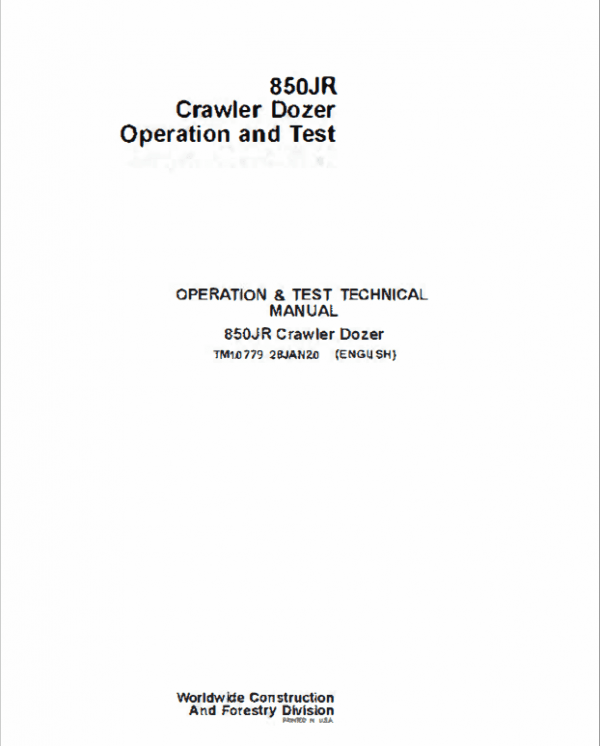 The John Deere 850JR Crawler Dozer Technical manuals are divided in two parts: Repair and Operation and Tests.
