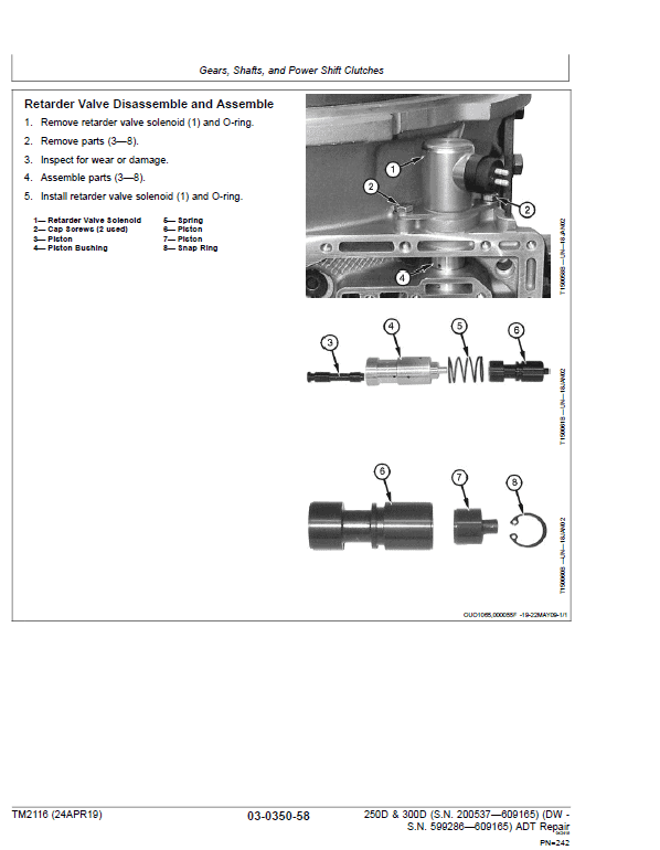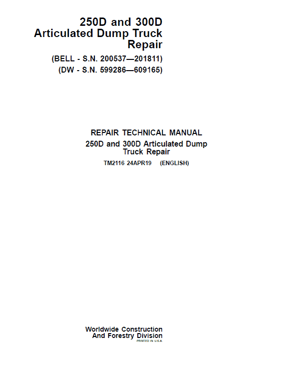 The John Deere 250D, 300D (BELL – S.N. 200537—201811 and DW – S.N. 599286—609165) Articulated Dump Truck Technical manuals are divided in two parts: repair and operation and tests. Repair sections tell how to repair the components. Operation and tests sections help you identify the majority of routine failures quickly.