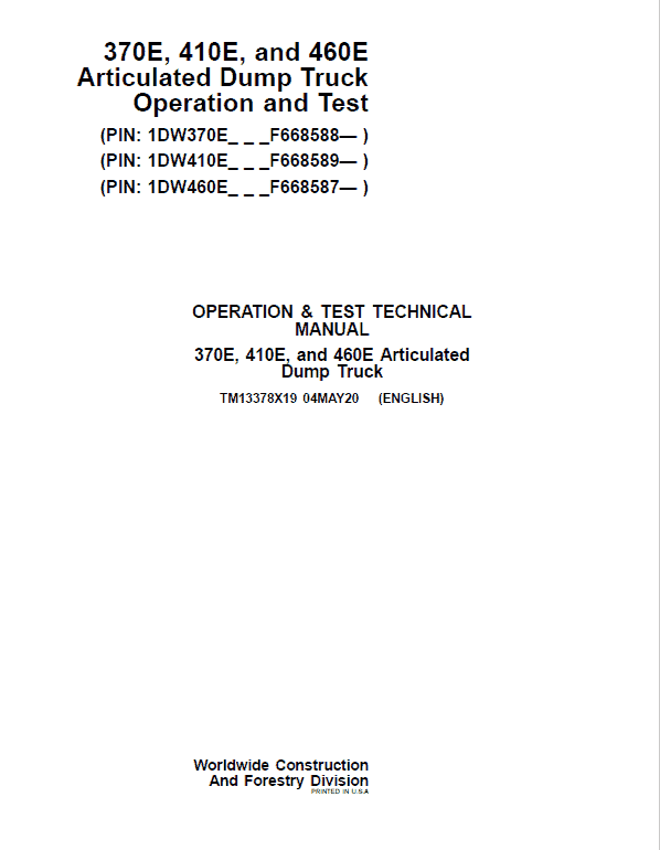 John Deere 370E, 410E, 460E Dump Truck Technical Manual (S.N. F634583 – F668586 )