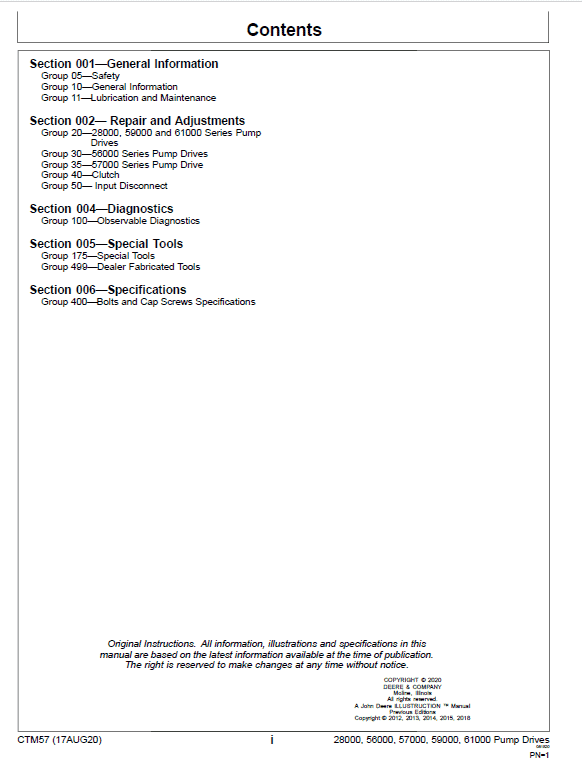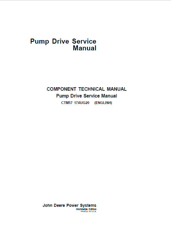 The John Deere Pump Drives Technical manuals CTM57 are divided as per the table of content. Repair sections tell how to repair the components. Diagnostic sections help you identify the majority of routine failures quickly.