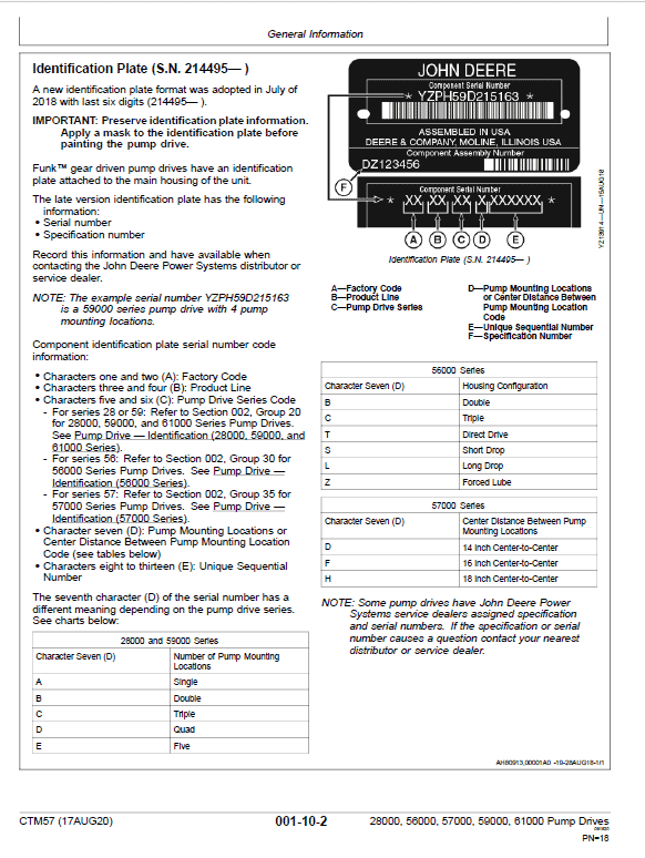 – For series 57: Refer to Section 002, Group 35 for 57000 Series Pump Drives. See Pump Drive — Identification (57000 Series).