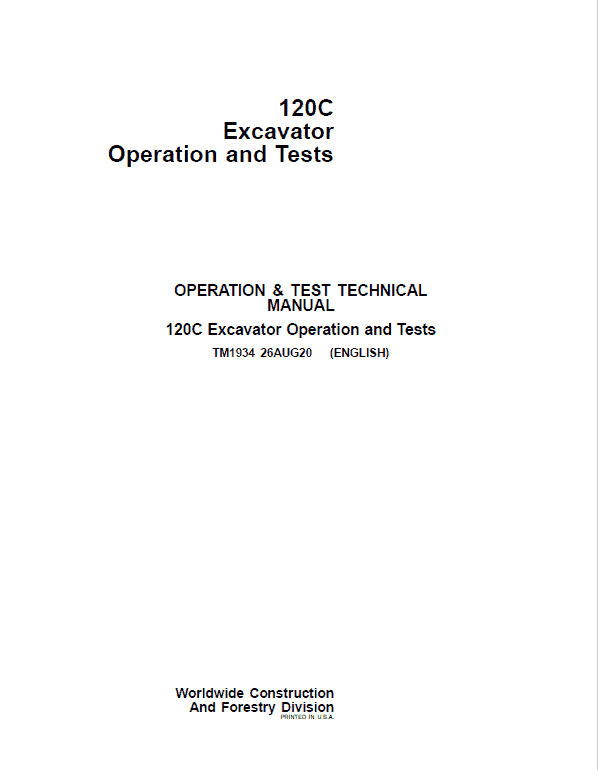The John Deere 120C Excavator Technical manuals are divided in two parts: repair and operation and tests. Repair sections tell how to repair the components. Operation and tests sections help you identify the majority of routine failures quickly.