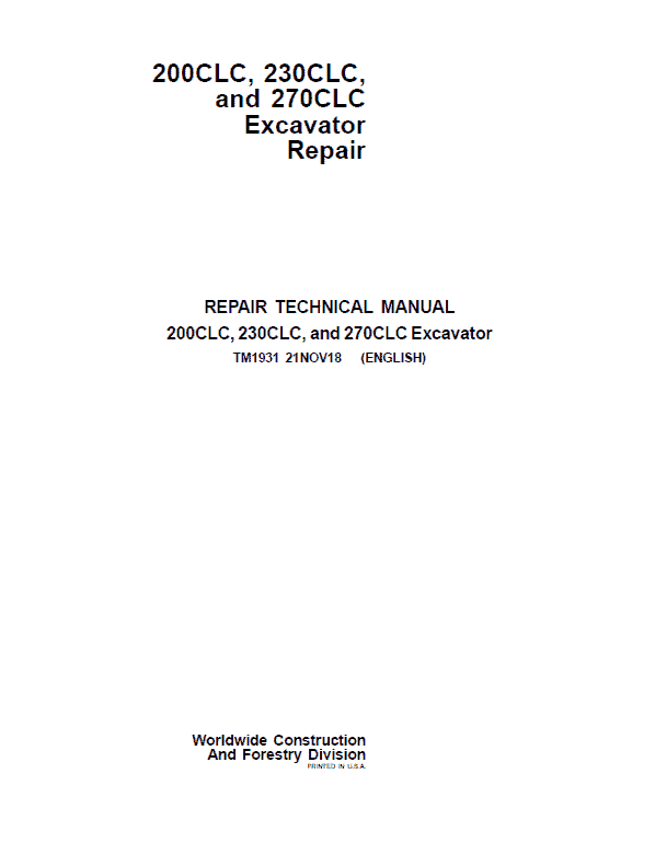 - John Deere 200CLC, 230CLC, 270CLC Excavator Repair Service Manual – 380 Pages (TM1931)