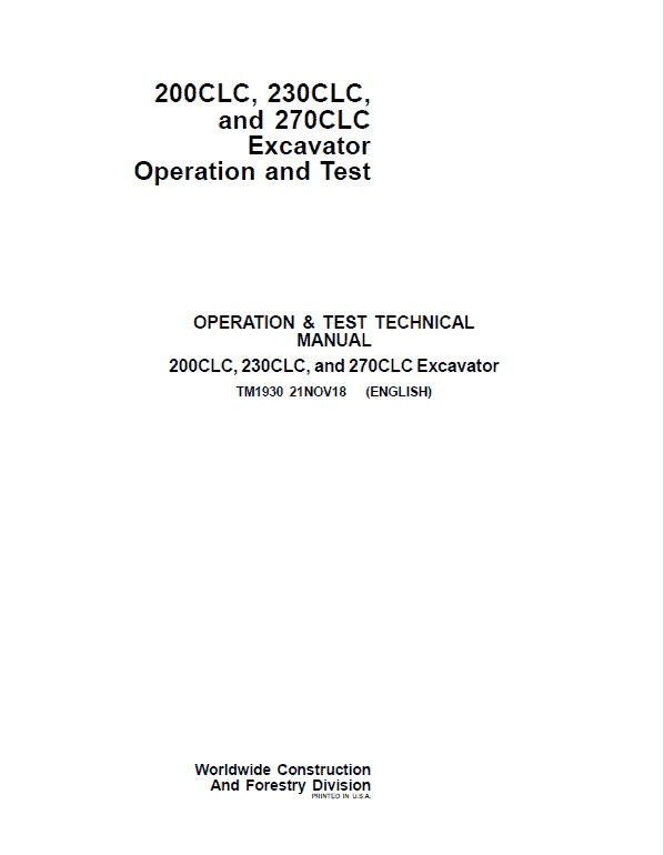 The John Deere 200CLC, 230CLC, 270CLC Excavator Technical manuals are divided in two parts: repair and operation and tests. Repair sections tell how to repair the components. Operation and tests sections help you identify the majority of routine failures quickly.