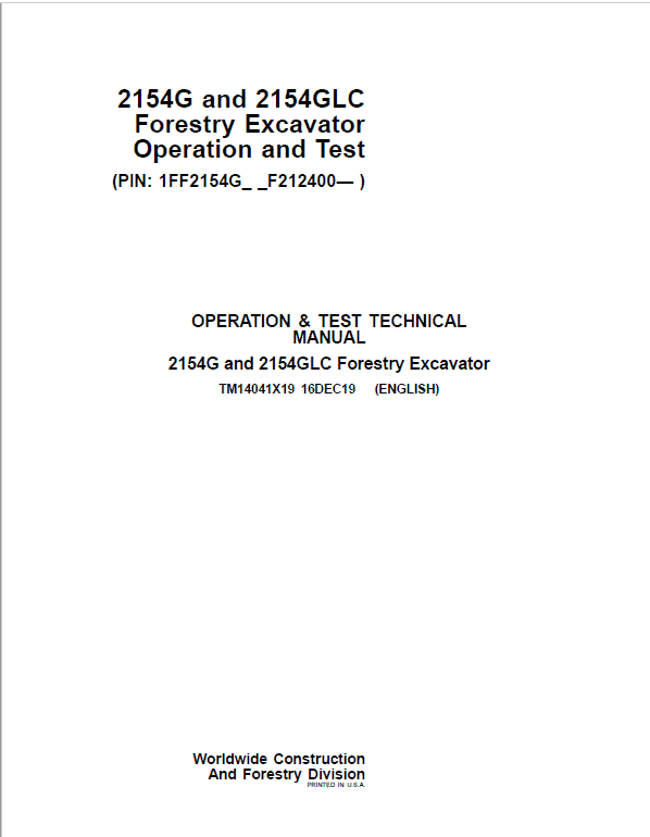 The John Deere 2154G, 2154GLC Excavator (S.N after F212001 -) Technical manuals are divided in two parts: repair and operation and tests. Repair sections tell how to repair the components. Operation and tests sections help you identify the majority of routine failures quickly.