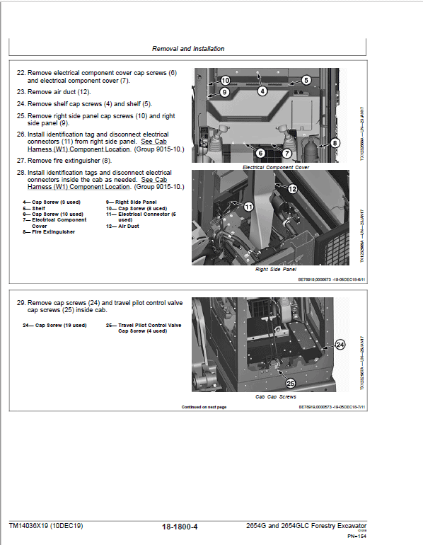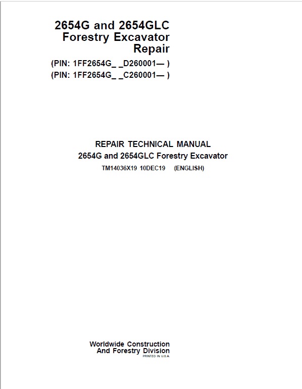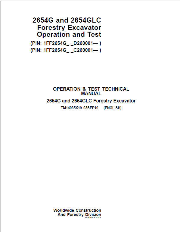 The John Deere 2654G, 2654GLC Excavator (S.N after C260001 & D260001-) Technical manuals are divided in two parts: repair and operation and tests. Repair sections tell how to repair the components. Operation and tests sections help you identify the majority of routine failures quickly.