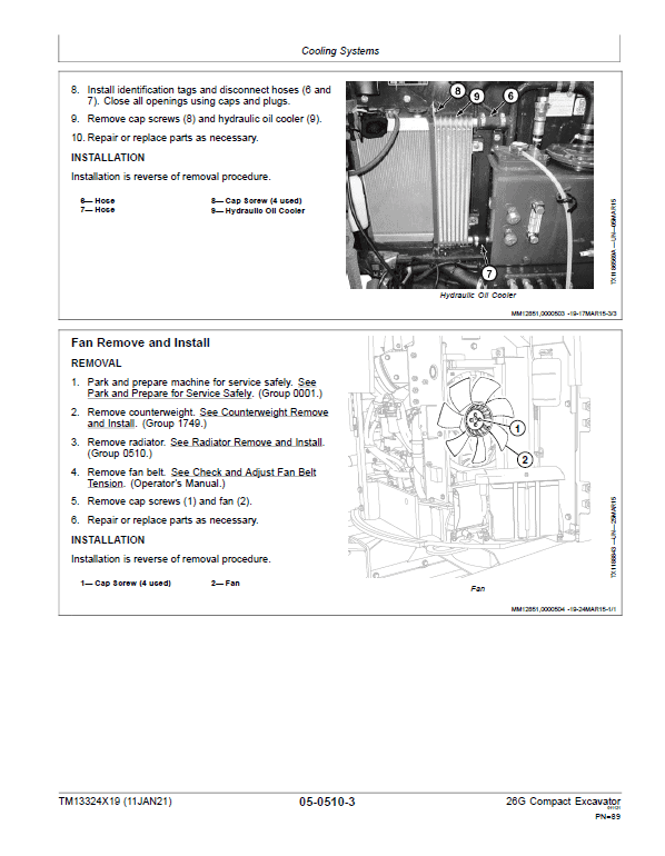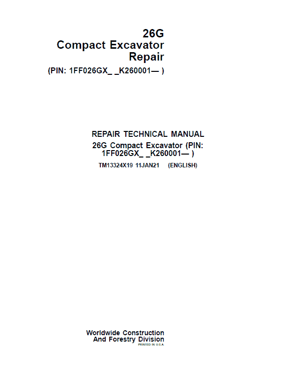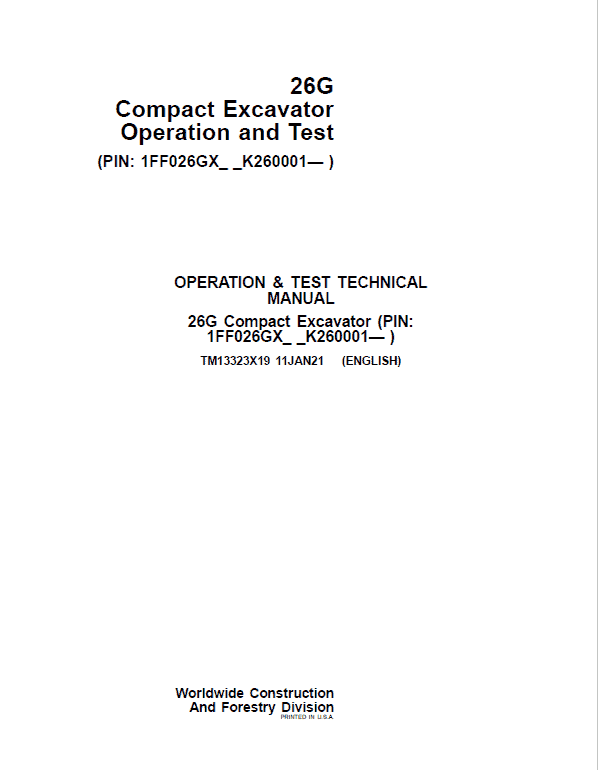The John Deere 26G Excavator (S.N after K260001) Technical manuals are divided in two parts: repair and operation and tests. Repair sections tell how to repair the components. Operation and tests sections help you identify the majority of routine failures quickly.
