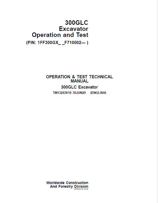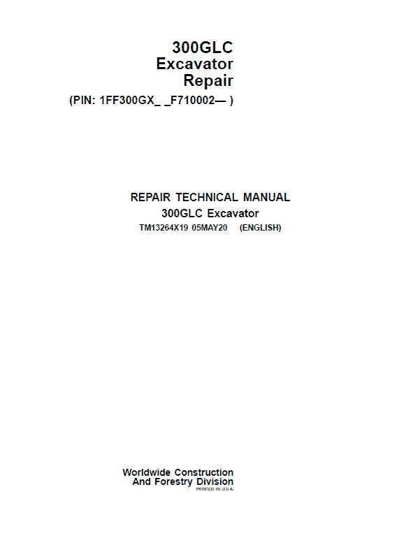 The John Deere 300GLC Excavator (S.N after F710002 – ) Technical manuals are divided in two parts: repair and operation and tests. Repair sections tell how to repair the components. Operation and tests sections help you identify the majority of routine failures quickly.