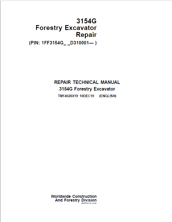 The John Deere 3154G Excavator (S.N after D310001 -) Technical manuals are divided in two parts: repair and operation and tests. Repair sections tell how to repair the components. Operation and tests sections help you identify the majority of routine failures quickly.