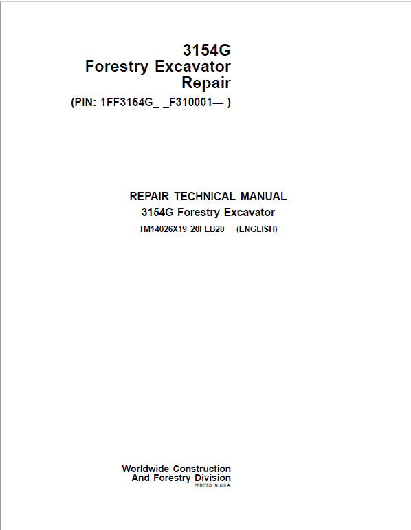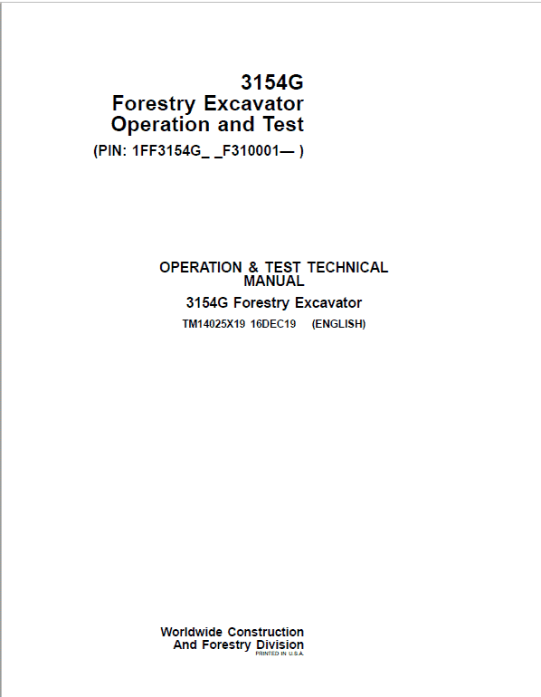 The John Deere 3154G Excavator (S.N after F310001-) Technical manuals are divided in two parts: repair and operation and tests. Repair sections tell how to repair the components. Operation and tests sections help you identify the majority of routine failures quickly.