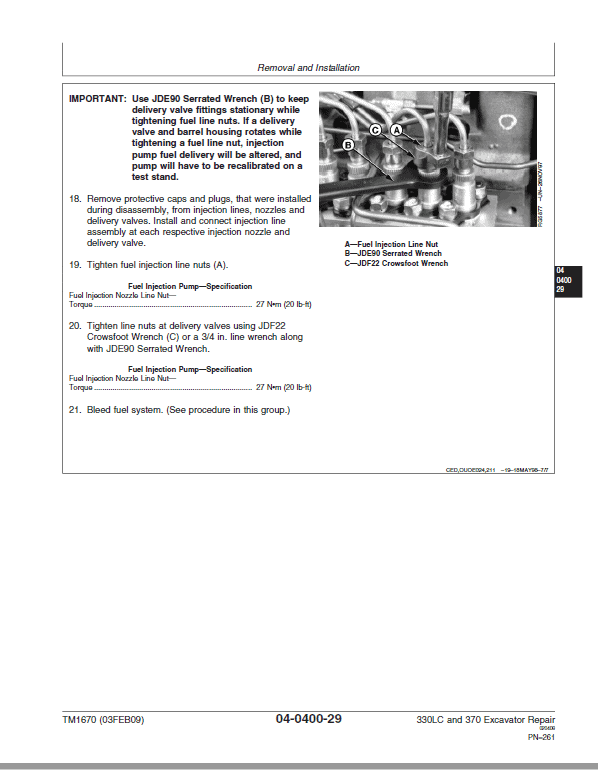 The John Deere 330LC, 370 Excavator Technical manuals are divided in two parts: repair and operation and tests. Repair sections tell how to repair the components. Operation and tests sections help you identify the majority of routine failures quickly.