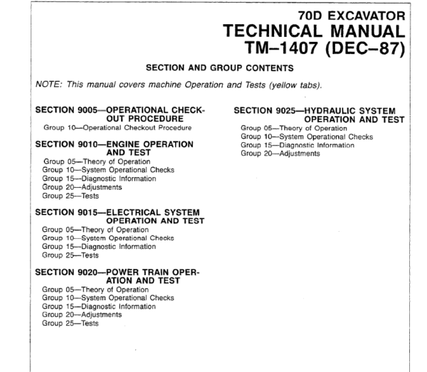 John Deere 70D Excavator Service Manual TM1407 Sections: