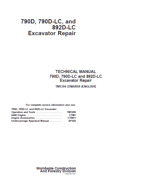 - John Deere 790D, 790D-LC, 892D-LC Excavator Repair Service Manual – 532 Pages (TM1395)