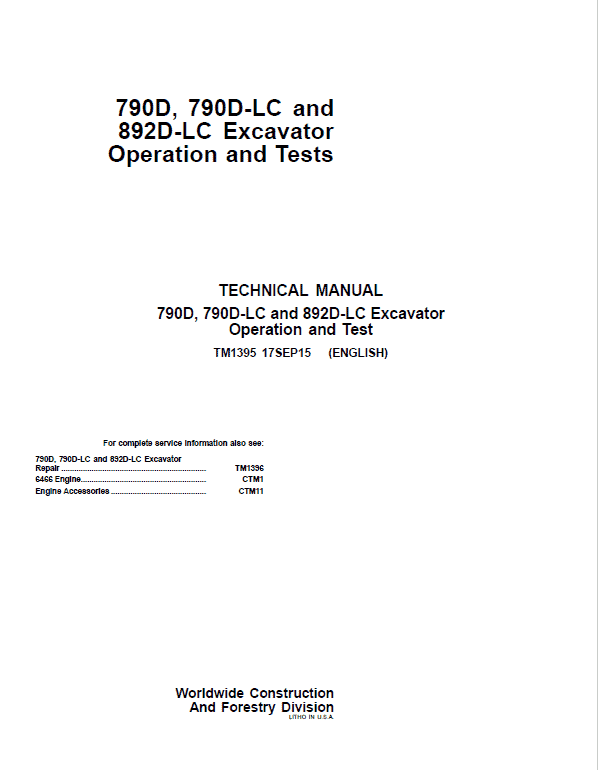The John Deere 790D, 790D-LC, 892D-LC Excavator Technical manuals are divided in two parts: repair and operation and tests. Repair sections tell how to repair the components. Operation and tests sections help you identify the majority of routine failures quickly.