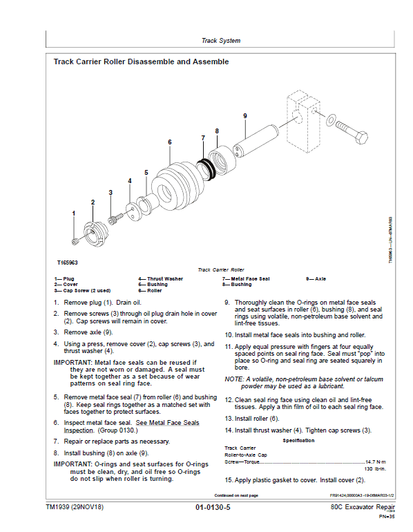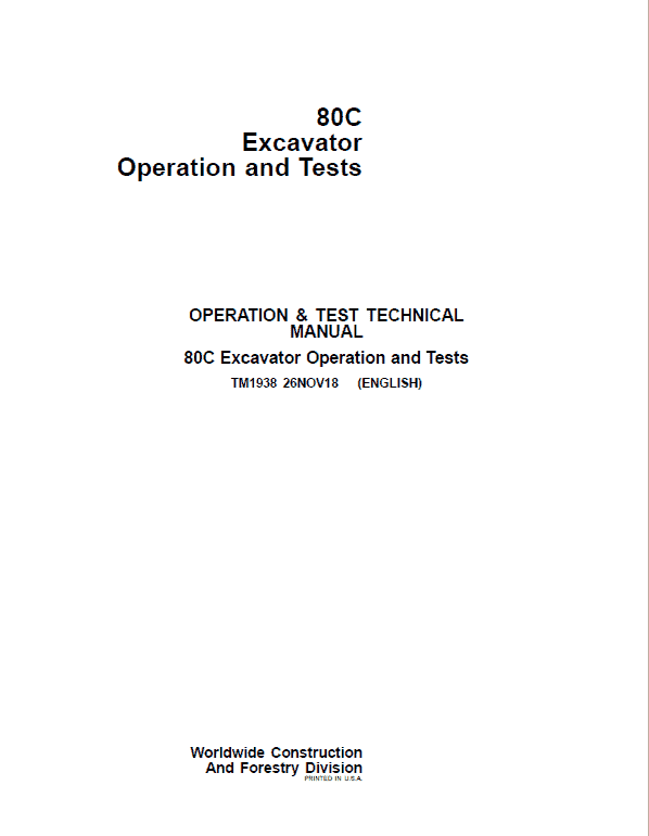 The John Deere 80C Excavator Technical manuals are divided in two parts: repair and operation and tests. Repair sections tell how to repair the components. Operation and tests sections help you identify the majority of routine failures quickly.