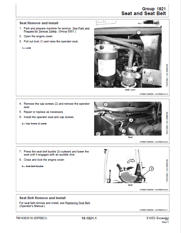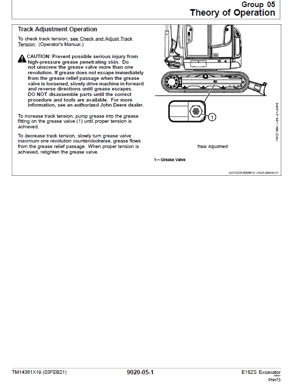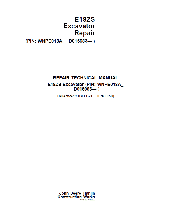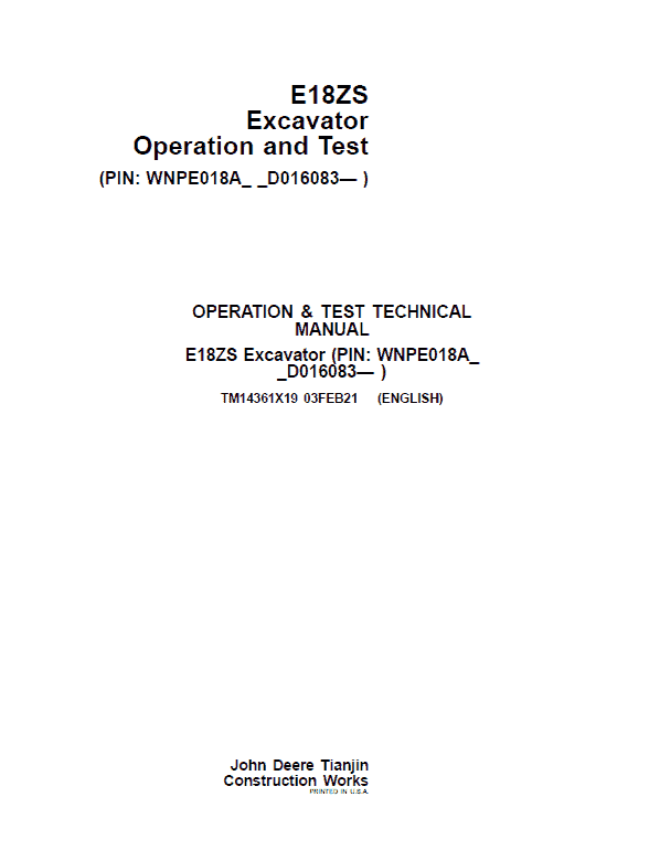 The John Deere E18ZS (PIN: WNCE018A_ _D016000—) Excavator Technical manuals are divided in two parts: repair and operation and tests. Repair sections tell how to repair the components. Operation and tests sections help you identify the majority of routine failures quickly.