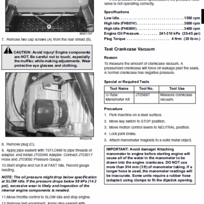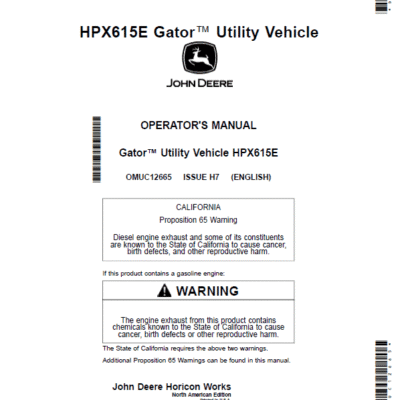 This Service Manual includes repair and maintenance information, detailed description of service and troubleshoot procedures, installation instructions, special instructions, other additional information for John Deere Gator Utility Vehicle.