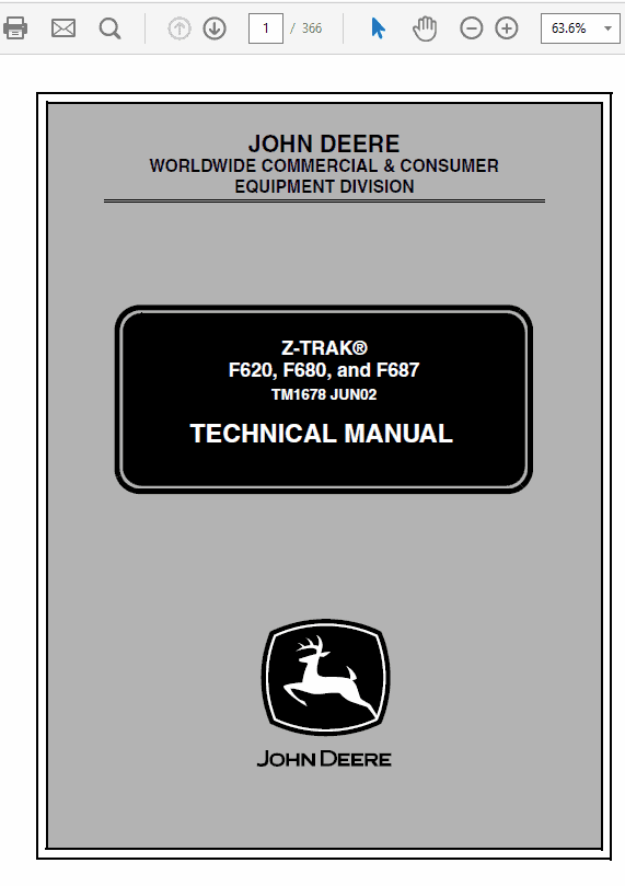 John Deere F620, F680, F687 ZTrak Service Manuals are concise service guides for a specific machine and are on the job guides containing only the vital information needed by a technician.