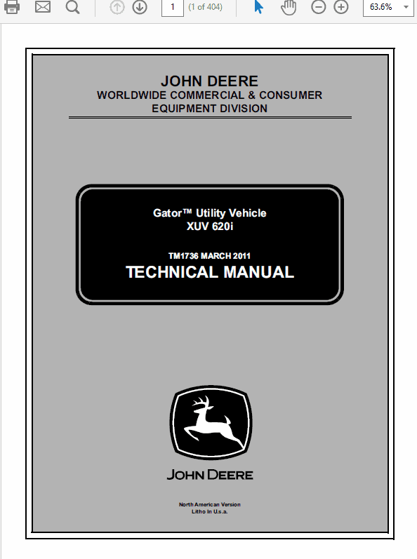 John Deere XUV 620i Gator Utility Vehicle Service Manuals are concise service guides for a specific machine and are on-the-job guides containing only the vital information needed by a technician.