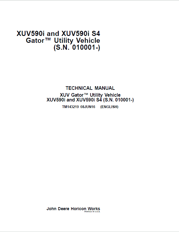 The John Deere XUV590i, XUV590i S4 Technical Manual is a concise guide for this specific machines. They are on-the-job guides containing only the vital information needed for diagnosis, analysis, testing, and repair.