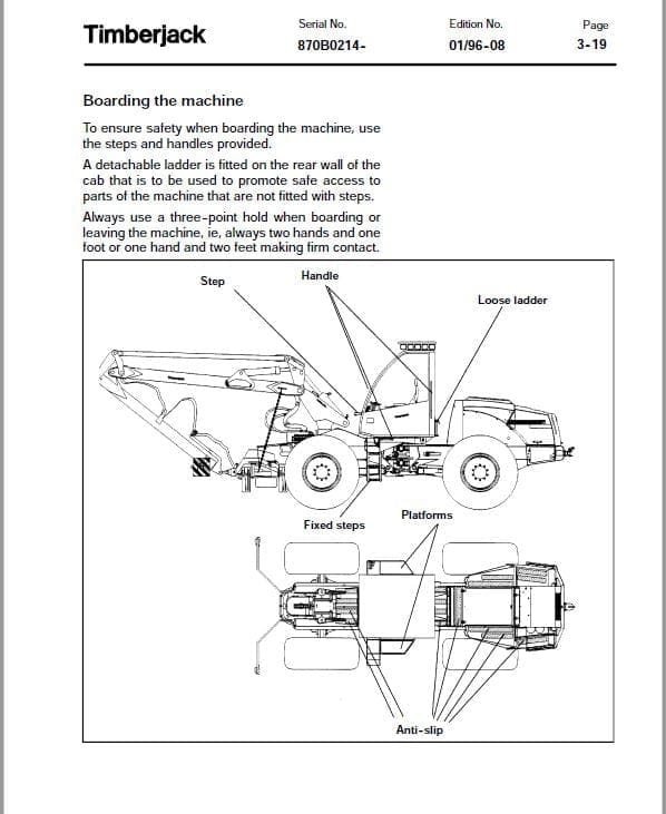 Where applicable throughout the text, “Safety Alert” symbols have been used to indicate important safety measures. Read carefully, understand, and follow these instructions to prevent hazardous situations that could lead to risk of personal injury.The instructions and procedures in this manual cover Forwarders with the most commonly used options; therefore pictorial presentation in some areas may vary slightly from the actual machine. This variation, however, does not have any impact on the accuracy of the written information. The information contained in this manual is current at the time of publication; however, continuing product improvement may result in changes to the machine which are not covered. Should information regarding such changes or further information on the machine be required, please contact your Timberjack dealer .